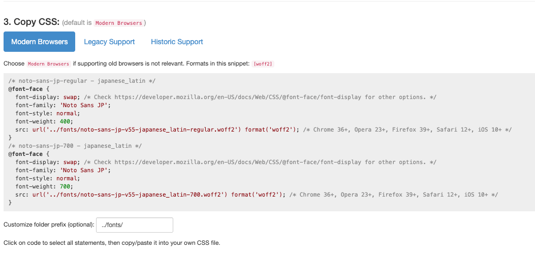 CSSにgoogle-webfonts-helperの「3.Copy CSS」のコードを入れていきます。